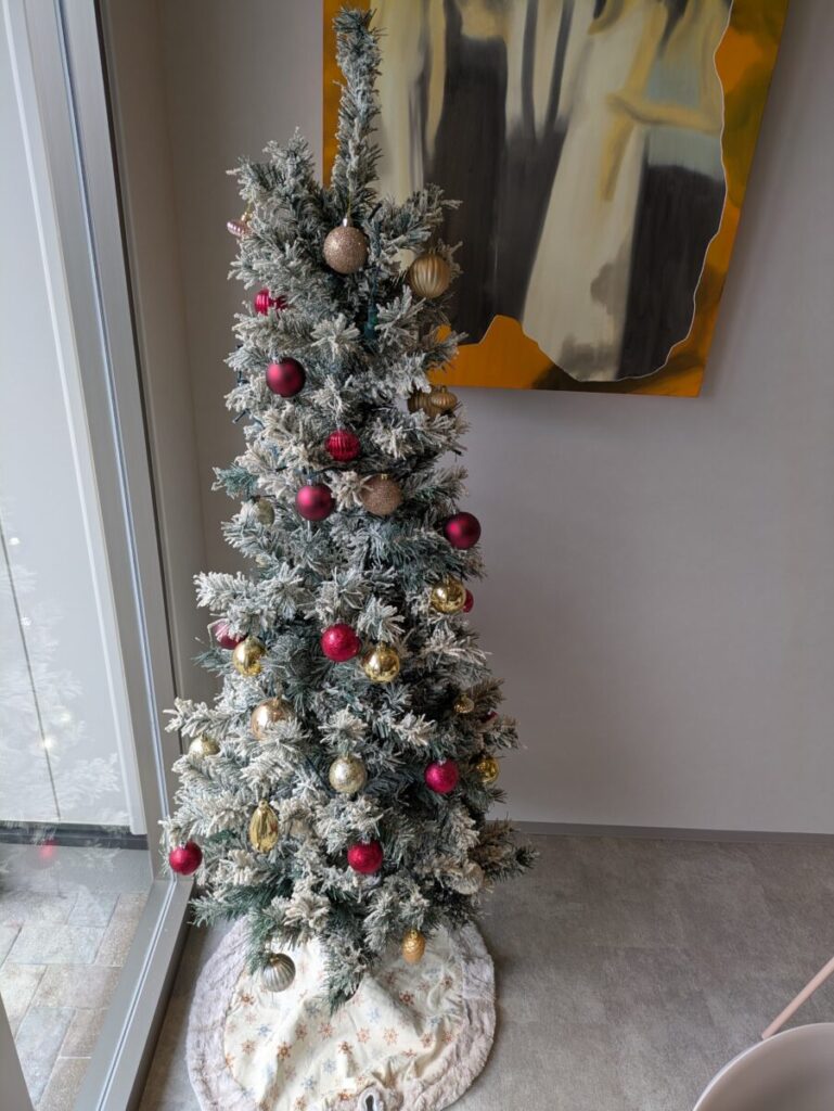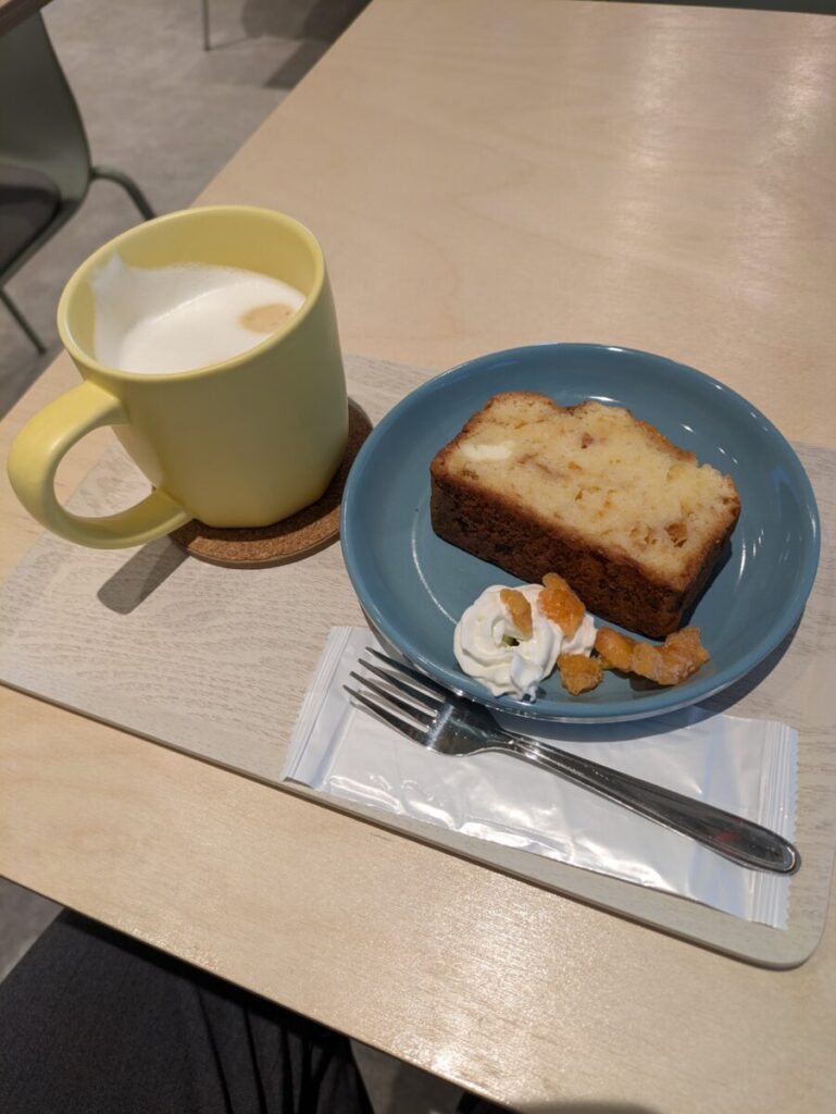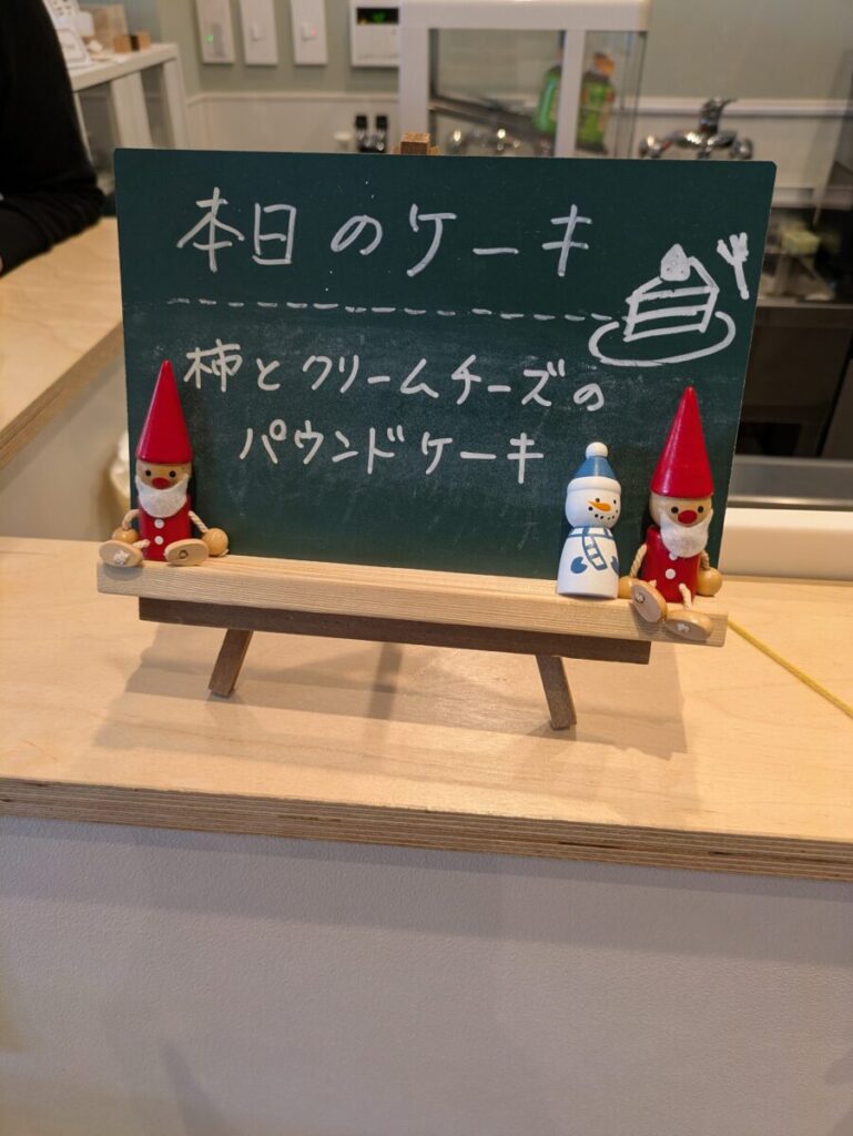 今日のケーキは柿とクリームチーズのパウンドケーキでした。12月の中旬に柿!?と思いましたが、近年なかなか涼しくならない秋であり、本格的に柿が美味しくなるタイミングが少し後ずれしているとのことです。そんな美味しい柿を使った今日のパウンドケーキは最高でした!でもそのパウンドケーキをお知らせする案内の飾りはサンタクロース!!店内にはツリーも飾られ、秋と冬が大きく近づいたと考えさせられました。
