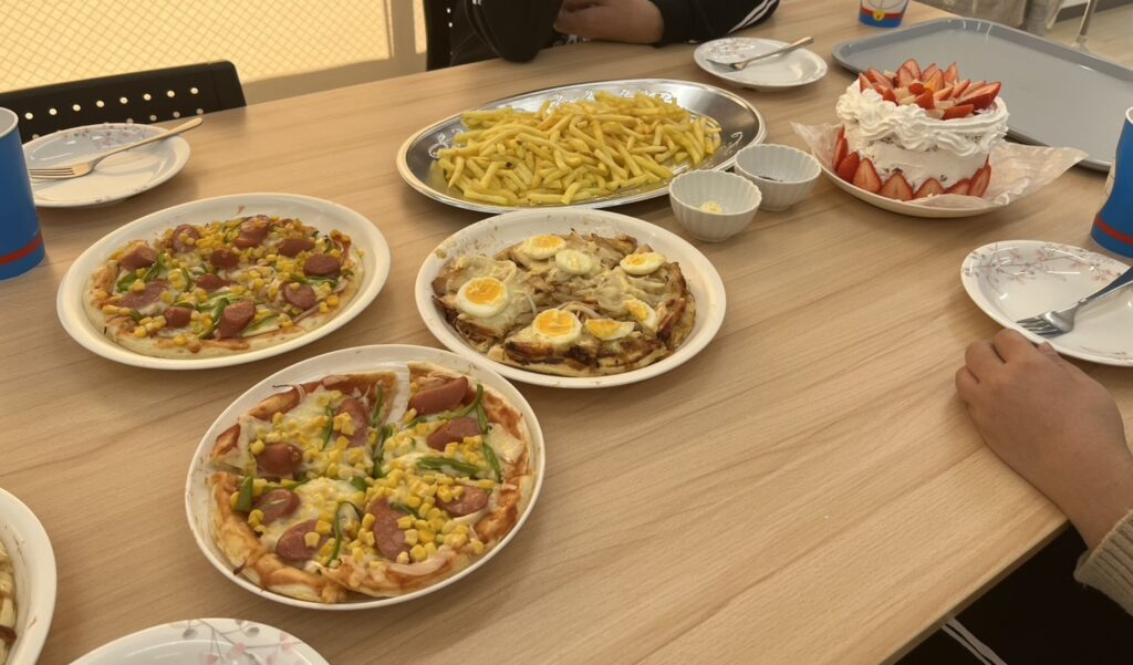 当日は、昼食としてピザ・ケーキを作り、