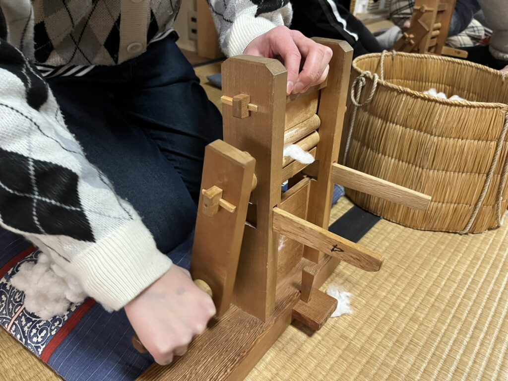 綿くり(綿花の実から種を取り出す作業)の体験を行い、
