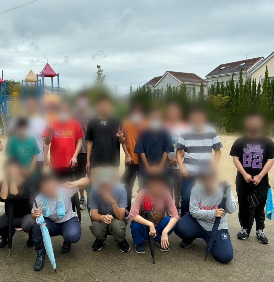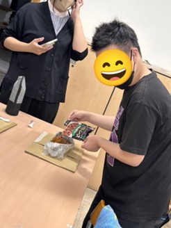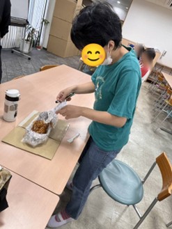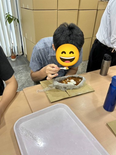 昼食は自分の作った新聞紙食器に防災食のご飯を入れて、